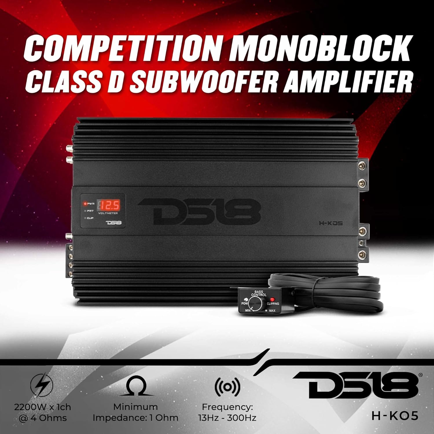 The DS18 H-KO5 HOOLIGAN KO is a high-efficiency Class-D monoblock subwoofer amplifier engineered to deliver powerful output for demanding audio systems. Finished in black (also available in red and titanium), this amplifier includes integrated controls and protective circuitry for reliable performance in high-power installations.