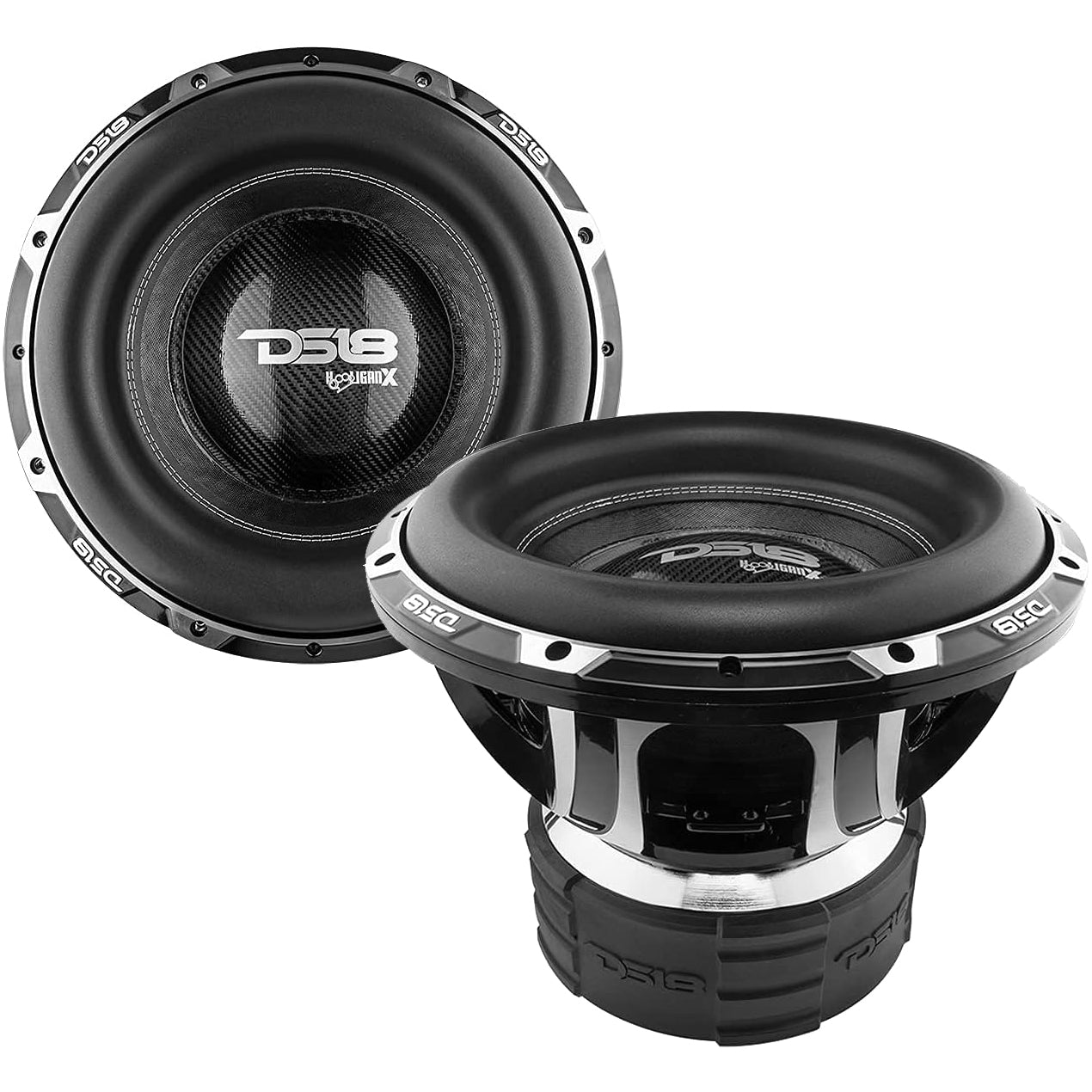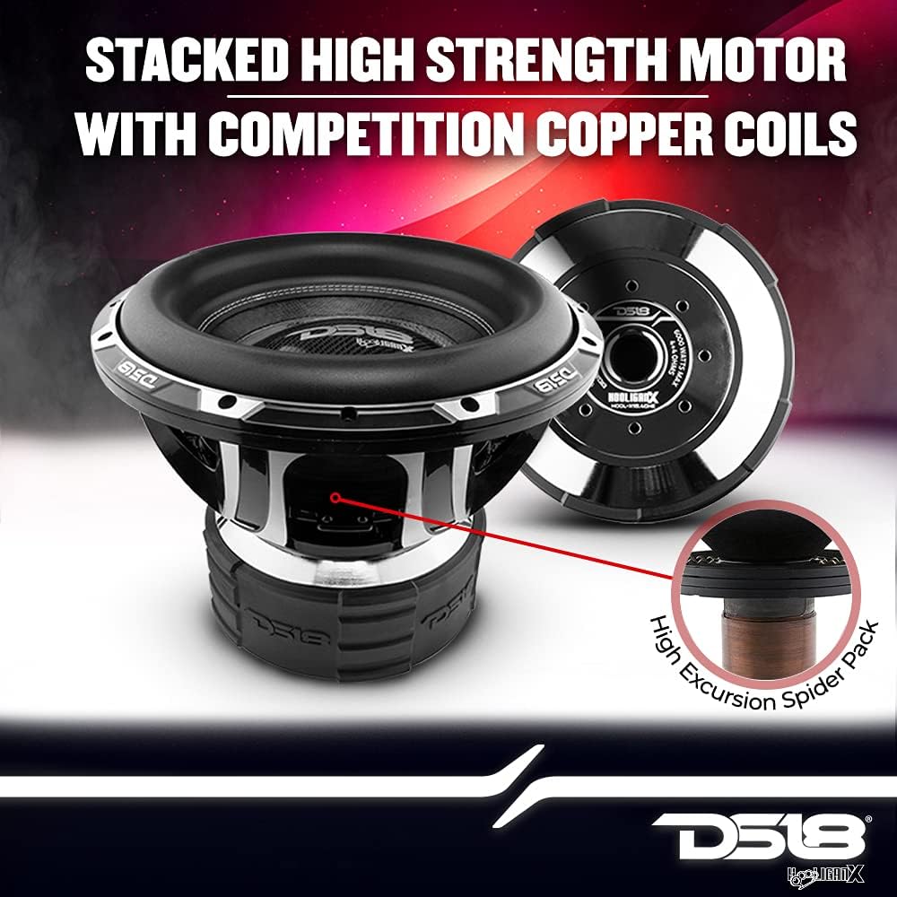 This listing is for two matched DS18 HOOL-X15.4DHE 15″ high-excursion subwoofers, engineered for extreme bass output and competition-level performance. Each subwoofer features a dual 4Ω voice coil, robust motor structure, and reinforced suspension for powerful low-frequency reproduction in sealed, ported, or advanced enclosure designs.