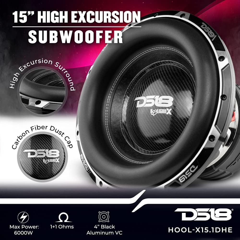The DS18 HOOL-X15.1DHE is a high-excursion 15-inch subwoofer engineered for extreme bass performance in competition and high-output car audio systems. Designed with a massive motor structure, reinforced suspension, and a high-temperature voice coil, this subwoofer delivers powerful low-frequency output with excellent control and durability.