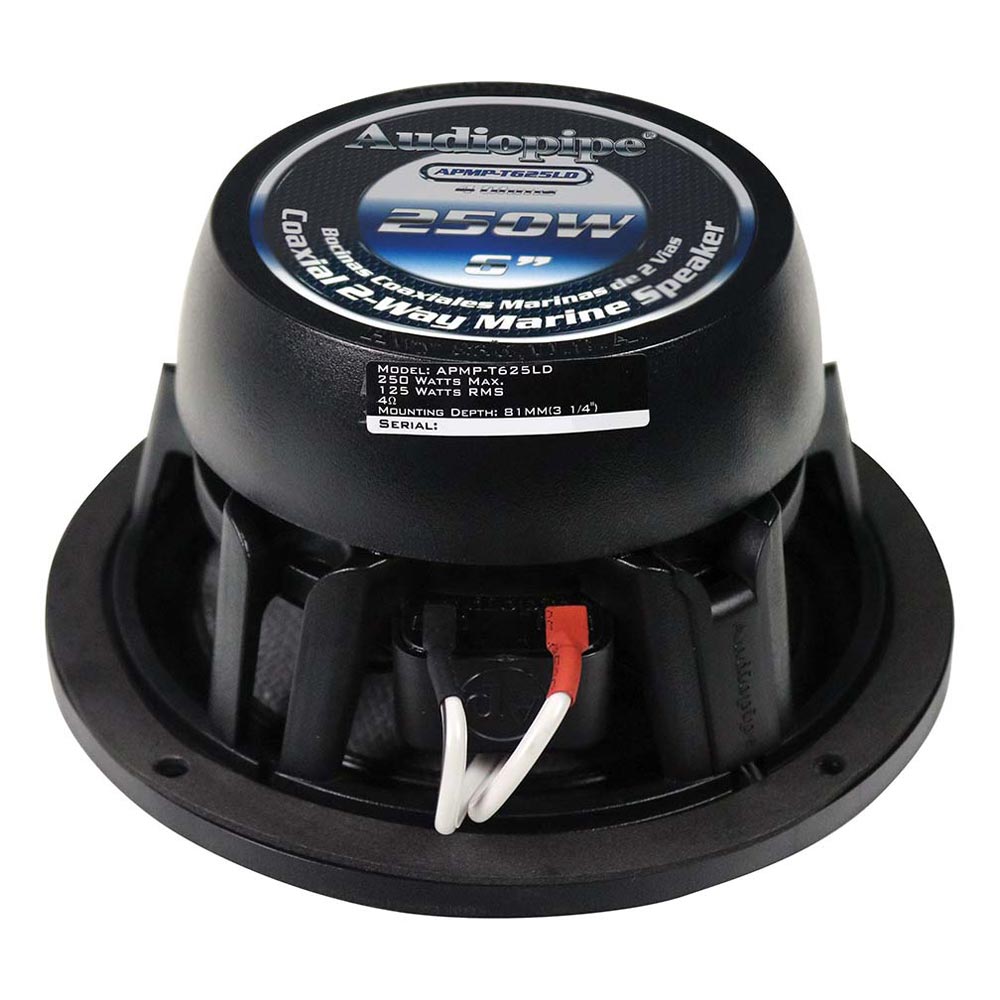 The Audiopipe APMP-T625LD marine-rated coaxial speaker is designed for durability, clarity, and reliable performance in boats, powersports vehicles, or open-air audio setups. Its 6.5″ carbon-fiber woofer, titanium dome tweeter, and 1.2″ Kapton voice coil give balanced sound with resilience to moisture and outdoor conditions. With waterproof construction and built-in LED lighting, it’s ready for both performance and style.