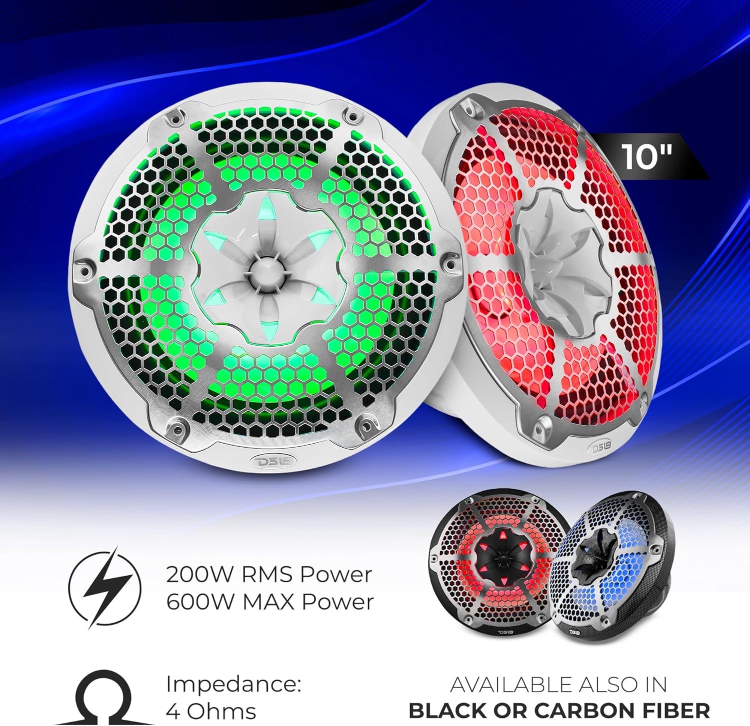 This white-finish pair of 10″ marine-rated coaxial speakers delivers powerful full-range sound for boats, UTVs, ATVs, wakeboard towers, and outdoor audio systems. Each speaker handles 200 W RMS (400 W RMS per pair) and up to 600 W peak, featuring a polypropylene woofer, butyl rubber surround, bullet-style tweeter, and integrated RGB LED lighting. Built to IP65 water-resistance standards, these speakers are designed to withstand harsh marine and outdoor conditions while maintaining strong output and clarity.
