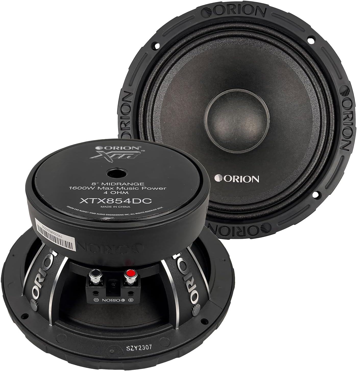 This matched pair of Orion XTX854DC midrange speakers delivers high-efficiency output and improved tonal projection with its rigid dust-cap cone design. Each 8″ driver includes a 1.5″ copper voice coil, ferrite magnet, and reinforced pressed paper cone for crisp, accurate mids. Rated at 400 W RMS and 1,600 W Peak per pair, these 4-ohm speakers are engineered for clean, powerful performance in car and pro-audio systems.