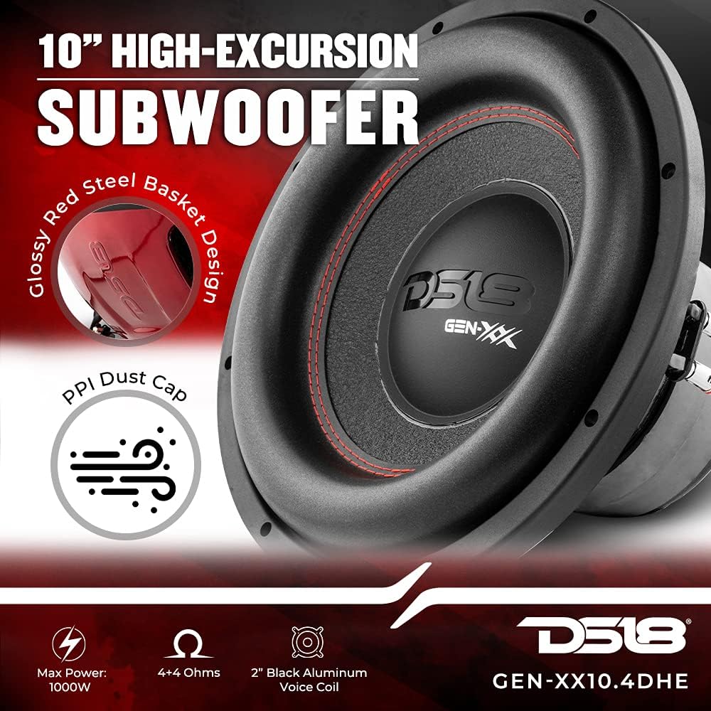 This listing is for TWO (2) DS18 GEN-XX10.4DHE 10-inch high-excursion subwoofers. These subwoofers are engineered for deep, powerful low-frequency performance in custom car audio systems. Each sub features dual 2-inch voice coils (4 ohm each), a heavy ferrite magnet motor, and a long-throw suspension system for strong bass output in sealed or ported enclosures.
